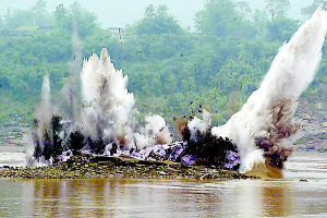 “5、4、3、2、1,起爆!”長(zhǎng)江重慶航道工程局副局長(zhǎng)魯靜發(fā)出指令,2秒后,一條黑色的長(zhǎng)龍騰空而起,一直沖到30米的高空,接著旁邊又有兩股稍短的黑風(fēng)沖出,同時(shí)十幾股水柱直沖云霄,組成一組寬大的水幕將石梁包圍,一陣震耳欲聾的轟響聲才由遠(yuǎn)及近地傳來(lái)。