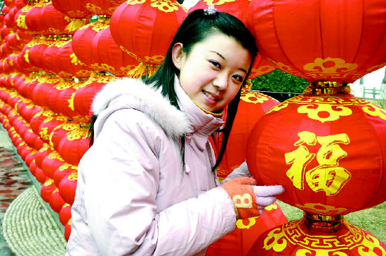 17日在濟(jì)南市大明湖風(fēng)景區(qū)內(nèi),一名游客在大紅“福”字燈籠前留影。目前,該公園入園處掛起了千余盞大紅燈籠。新華社發(fā)