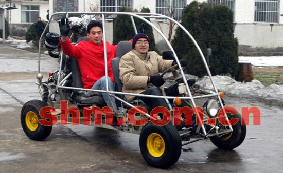 窯鎮(zhèn)沙子小學(xué)門口時(shí),只見(jiàn)一輛“裸車”赫然出現(xiàn)在記者面前,雖然沒(méi)有豪華外表,它與普通轎車似乎沒(méi)有什么太大的區(qū)別:方向盤、后視鏡、里程表、變速桿、發(fā)動(dòng)機(jī)……一應(yīng)俱全。為了向記者展示汽車的性能,它的主人———牟平區(qū)大窯鎮(zhèn)沙子小學(xué)美術(shù)老師劉斌興致勃勃地邀請(qǐng)了牟平區(qū)的趙先生坐在他的車上。經(jīng)過(guò)短暫的“熱車”之后,劉斌便在學(xué)校操場(chǎng)上玩起了車技,只見(jiàn)汽車時(shí)而從記者眼前飛馳而過(guò),時(shí)而調(diào)轉(zhuǎn)方向,時(shí)而鳴笛,時(shí)而慢行倒車,方向盤在劉斌的手中像玩具一樣左右旋轉(zhuǎn)。坐在劉斌身后的趙先生不時(shí)向記者伸出大拇指并連連點(diǎn)頭。