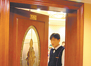 昨晚9時,在該飯店的503室,昨日凌晨值班的服務員吳小娟有些害怕地說,大約零時左右,6男8女來到這個房間!澳菐讉男的明顯是喝過酒,眼睛紅紅的,嘴里噴著酒氣!