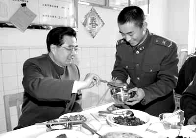 圖:2005年2月2日,春節(jié)來臨之際,胡錦濤到北京軍區(qū)地空導彈某部同連隊官兵共進午餐