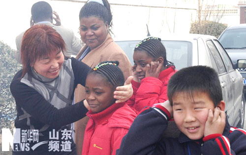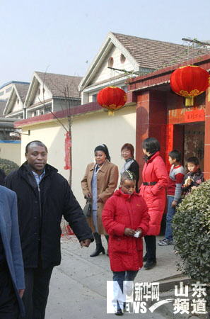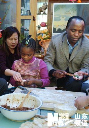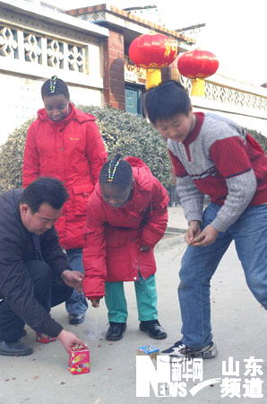 新華網(wǎng)山東頻道1月29日電 來自非洲盧旺達(dá)的阿納斯一家在山東省鄒平縣西王村與村民一樣備年貨、貼春聯(lián)、包餃子、放鞭炮歡度2006年春節(jié)。阿納斯畢業(yè)于江蘇省江南大學(xué)并獲得博士學(xué)位,2005年7月應(yīng)聘山東省西王集團(tuán)技術(shù)中心主任職務(wù),便與妻子阿格內(nèi)斯和兩個女兒一家4口“落戶”西王村。(記者 吳增祥 攝)