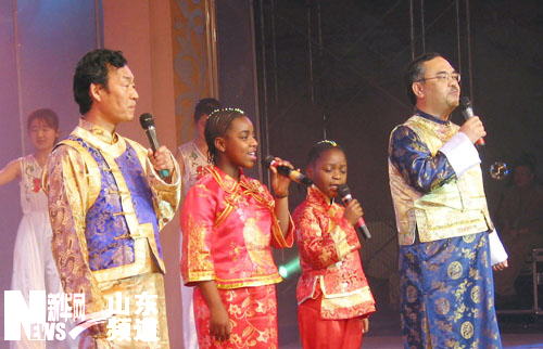 1月27日,在鄒平縣舉辦的春節(jié)晚會上,阿納斯博士的女兒琳達(dá)(左二)、貝利絲(左三)與西王集團(tuán)的外國專家一起演唱自編的中文歌曲《走進(jìn)西王》。