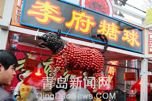 ??? 在另一處糖球商家的攤位前,聚集了很多市民在拍照留念,而吸引大家的道具是一只巨大的糖球狗。整個(gè)狗身由各種各樣不同口味的糖球拼成,有山楂,有蜜棗,有金桔,摸一下,手上還有粘粘的感覺,一位拍照留念的市民說:"農(nóng)歷狗年,這只糖球狗給人一種吉祥如意、狗年萬事順利的感覺,真是讓人喜歡。"