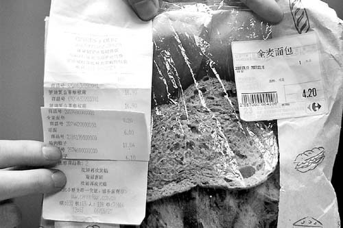 圖片說(shuō)明:武先生在家樂(lè)福雙井店購(gòu)買(mǎi)全麥面包生產(chǎn)日期是“2007.03.17”。記者董海東/攝影