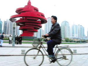 這名市民違規(guī)騎著自行車進(jìn)入五四廣場 曲玉珍