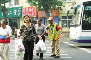 網(wǎng)友“babyblue”半個月前在遼寧路、黃臺路路口拍攝到協(xié)警員攙扶老人過馬路