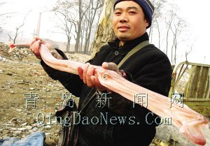 昨天,膠南漁民老趙向記者展示他捕到的“怪魚”。前天下午老趙在瑯琊海域捕回一條長(zhǎng)1.52米重約1.2公斤的紅色“怪魚”,當(dāng)?shù)匾晃挥薪?jīng)驗(yàn)的漁民判斷這極可能是條海龍,但這么 大個(gè)的海龍非常罕見。記者 趙玉勛 攝影報(bào)道