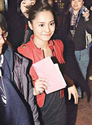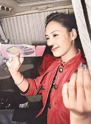 阿嬌玩至凌晨三時許離開卡拉OK,手持粉紅色信封及光盤,上車時笑容滿面