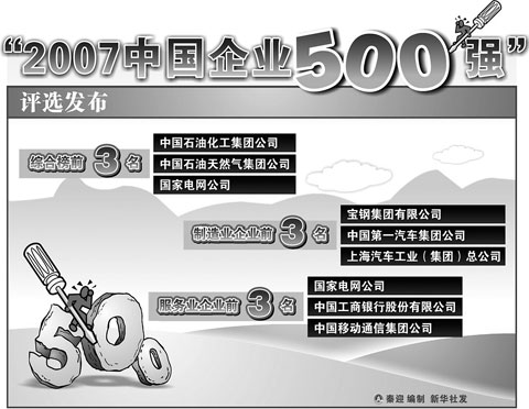 ???????由中國(guó)企業(yè)聯(lián)合會(huì)和中國(guó)企業(yè)家協(xié)會(huì)評(píng)選的“2007中國(guó)企業(yè)500強(qiáng)”1日發(fā)布。中國(guó)石油化工集團(tuán)公司以營(yíng)業(yè)收入超過1萬億元的業(yè)績(jī),穩(wěn)居綜合榜榜首。