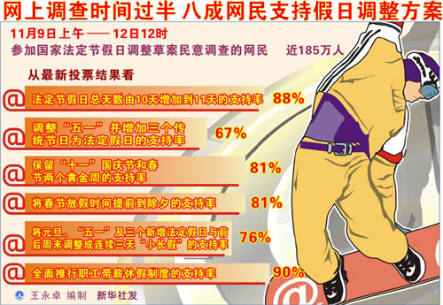 ???????新華網(wǎng)武漢11月13日電(記者沈翀)國(guó)家法定節(jié)假日調(diào)整草案網(wǎng)上調(diào)查時(shí)間過半,綜合調(diào)查支持率在八成以上。但調(diào)整“五一”長(zhǎng)假與5個(gè)小長(zhǎng)假方案的支持率卻只有67%和76%,仍有不少人支持保留“五一”長(zhǎng)假。這在某種程度上反映出,老百姓對(duì)5日國(guó)務(wù)院法制辦發(fā)布的《職工帶薪年休假規(guī)定(草案)(征求意見稿)》能否落到實(shí)處,仍存有普遍疑慮。