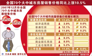 ????? 本報(bào)訊 據(jù)國(guó)家發(fā)展改革委、國(guó)家統(tǒng)計(jì)局調(diào)查顯示,2007年12月,全國(guó)70個(gè)大中城市房屋銷售價(jià)格同比上漲10.5%,漲幅與上月持平;環(huán)比上漲0.2%,漲幅比上月降低0.6個(gè)百分點(diǎn)。