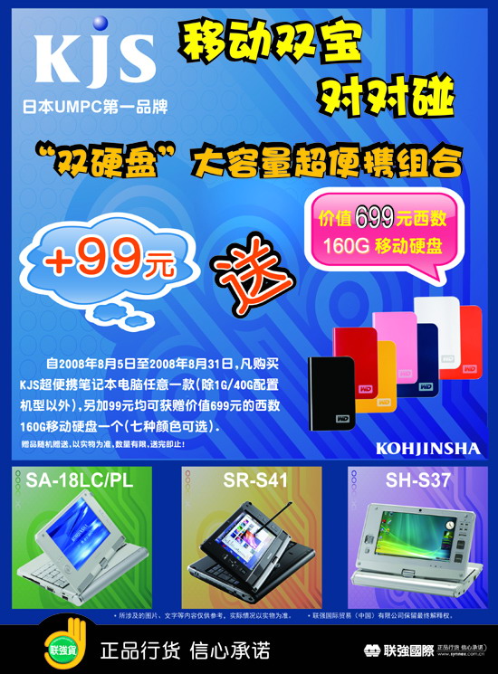????暑期號(hào)角一響,IT市場(chǎng)也逐漸開始升溫,各大廠商都開始推出各種各樣的促銷活動(dòng)。近日,聯(lián)強(qiáng)國(guó)際宣布旗下代理的KJS 全系列UMPC開始進(jìn)行“移動(dòng)雙寶對(duì)對(duì)碰”優(yōu)惠促銷活動(dòng),自2008年8月5日—2008年8月31日,凡購(gòu)買KJS超便攜筆記本電腦任意一款(除1G40G配置機(jī)型以外),另加99元便可獲贈(zèng)價(jià)值699元的西數(shù)160G移動(dòng)硬盤一個(gè)(七種顏色可選)贈(zèng)品隨機(jī)贈(zèng)送,先到先得,多買多送,贈(zèng)品數(shù)量有限,送完為止。