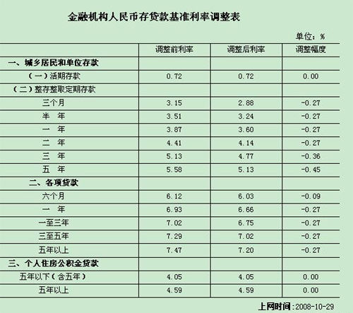 ????核心提示:中國(guó)人民銀行決定,從2008年10月30日起下調(diào)金融機(jī)構(gòu)人民幣存貸款基準(zhǔn)利率,一年期存款基準(zhǔn)利率由現(xiàn)行的3.87%下調(diào)至3.60%。