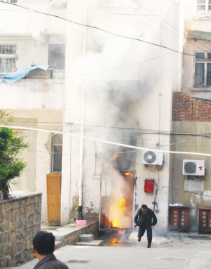 眼前的景象嚇了大家一跳:火勢已經蔓延開,大火從房間門的上窗口直躥向二樓。更嚴重的是,超市的店主還困在屋里,而屋里的液化氣罐也被大火燒得直冒煙,隨時可能爆炸!