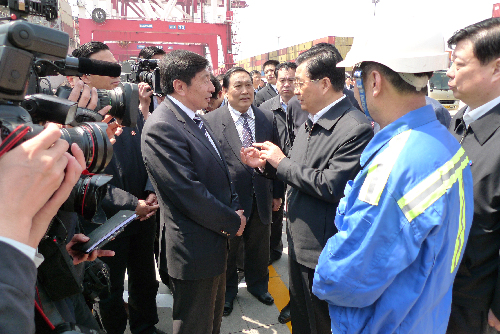 ????2009年4月22日,“五一”國(guó)際勞動(dòng)節(jié)前夕,中共中央總書記、國(guó)家主席、中央軍委主席胡錦濤同志,專程來(lái)港視察,在前灣三期集裝箱碼頭現(xiàn)場(chǎng)聽(tīng)取青島港工作匯報(bào),親切看望許振超和“振超團(tuán)隊(duì)”,充分肯定青島港在危機(jī)下發(fā)揚(yáng)工人階級(jí)的主人