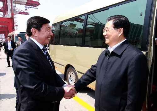 ??? 2009年4月22日,中共中央總書記、國(guó)家主席、中央軍委主席胡錦濤來(lái)青島港視察,與青島港集團(tuán)董事局主席、總裁常德傳親切握手。