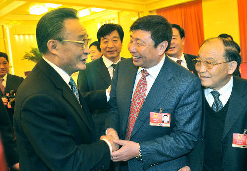 ??? 2009年3月7日,兩會期間,吳邦國委員長參加山東代表團(tuán)審議。對青島港的生產(chǎn)非常關(guān)心,對青島港集裝箱去年實(shí)現(xiàn)1000萬標(biāo)準(zhǔn)箱大跨越表示充分肯定。吳邦國委員長(左)親切接見集團(tuán)董事局主席、總裁常德傳。