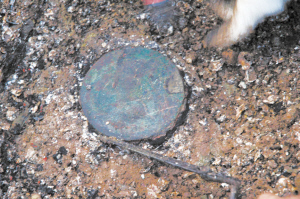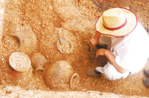 氧化了的銅鏡 ????前天上午,在膠州市九龍鎮(zhèn)雙嶺村一土石方施工工地里,一輛挖掘機(jī)意外刨到了三個(gè)被貝殼覆蓋的古代墓葬,當(dāng)?shù)卮迕窳⒓磁c膠州文物部門取得了聯(lián)系。昨天,經(jīng)膠州市文物專家現(xiàn)場(chǎng)發(fā)掘,共出土玉器、陶罐、漆器、銅鏡、錢幣等文物10多件。文物專家初步鑒定認(rèn)為,這些文物屬于西漢時(shí)期,三座墓葬也是 ????現(xiàn)場(chǎng) ????三座古墓全被貝殼“包裹” ????“有人在村前土石方施工工地上,意外發(fā)現(xiàn)了三座古墓?!弊蛱焐衔?,膠州九龍鎮(zhèn)雙嶺村村民張先生打電話告訴記者。昨天上午,記者趕到現(xiàn)場(chǎng)看到,三座古墓葬呈南北向依次排列,都呈長(zhǎng)方形,古墓被厚厚的一層貝殼“包裹”起來(lái),其中最南端的一處墓葬已經(jīng)發(fā)掘完畢,現(xiàn)場(chǎng)文物工作者正在對(duì)中間位置的第二處墓葬進(jìn)行發(fā)掘。為了保護(hù)文物安全,當(dāng)?shù)鼐脚沙隽硕嗝窬诂F(xiàn)場(chǎng)保護(hù)。 ???發(fā)掘 ????尸骨口中含有玉璧 ????“這是什么骨頭,怎么不像是人骨?”在第二處墓葬底部工作人員在清理時(shí),突然發(fā)現(xiàn)了一堆骨頭。經(jīng)過仔細(xì)清理辨認(rèn),這堆骨頭是動(dòng)物殉葬品的骸骨。隨后,發(fā)掘人員從墓葬主人尸骨的口中發(fā)現(xiàn)了一塊方形玉璧,在尸骨中還發(fā)現(xiàn)了一塊圓形玉佩。截止到中午12時(shí)許,第二座墓葬發(fā)掘完畢,緊接著發(fā)掘人員又對(duì)第三處墓葬進(jìn)行發(fā)掘。 ????在將覆蓋在墓葬上的貝殼清除后,發(fā)掘人員在第三座墓葬中又發(fā)現(xiàn)了陪葬的動(dòng)物骨頭。“小心!別碰壞了這些陶罐?!痹诘谌幠乖岬撞康挠医俏恢?,發(fā)掘人員發(fā)現(xiàn)了5個(gè)陶罐。其中4個(gè)陶罐呈正方形排列,個(gè)頭差不多大,單個(gè)高約30厘米,直徑近20厘米。而在4個(gè)陶罐的中間位置,則橫放有一個(gè)高約20厘米,直徑近15厘米的小陶罐。 ????讓發(fā)掘人員感到驚喜的是,在隨后發(fā)掘中,他們還發(fā)現(xiàn)一個(gè)已經(jīng)腐爛漆器的痕跡?!斑@肯定是一個(gè)王侯或者貴族的墓葬,當(dāng)時(shí)的百姓家里是不會(huì)有漆器的。”發(fā)掘人員對(duì)記者說(shuō)。 ????下午5時(shí)許,第三座墓葬也發(fā)掘完畢。記者了解到,此次三座墓葬共發(fā)掘出玉器、陶罐、漆器、銅鏡、錢幣等文物10多件。 ???鑒定 ????初步推斷是西漢貴族墓 ????“這些覆蓋在墓葬內(nèi)的貝殼除了有一定身份的人才能使用外,重要的是它們還能通風(fēng)和防腐?!爆F(xiàn)場(chǎng)文物工作者告訴記者,通過出土文物來(lái)看,逐步斷定這是距今近2000年西漢時(shí)期的墓葬。而從墓葬構(gòu)造以及陪葬品可以看出,這是一個(gè)西漢時(shí)期貴族家族墓葬,級(jí)別應(yīng)該不低于侯爵?!耙郧耙苍l(fā)掘過不少漢墓,但像類似的漢墓則少之又少?!蔽奈锕ぷ髡吒嬖V記者,這三處墓葬的發(fā)現(xiàn),對(duì)研究當(dāng)?shù)貪h代時(shí)期的風(fēng)土人情又提供了重要實(shí)物依據(jù)。(牟成梓 攝影報(bào)道) |