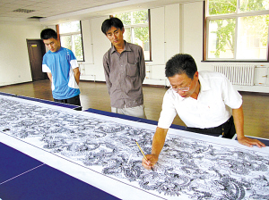 ![]() ????早報(bào)訊 膠州北關(guān)辦事處退休教師郭維全設(shè)計(jì)的《中國龍》6米剪紙長卷(圖),已完成設(shè)計(jì)稿和剪紙稿。昨天,記者了解到,這幅剪紙作品本周就可完成,作為獻(xiàn)給國慶的禮物捐獻(xiàn)給當(dāng)?shù)赜嘘P(guān)部門保存。 ????昨日,記者在現(xiàn)場看到,長卷是一幅類似《清明上河圖》的風(fēng)俗畫,長600厘米,寬70厘米。畫面內(nèi)容以一條巨幅坐龍為中心與左右兩邊的59條長龍組成一個(gè)整體,群龍?jiān)谙樵浦酗w行?!拔覀冏鎳蠹彝ザ际驱埖膫魅?,中國龍剪紙?jiān)⒁鈶c國慶盛世?!惫S全說,從今年3月份開始,他就開始著手準(zhǔn)備策劃構(gòu)思,他查閱了大量關(guān)于龍的資料圖片,前幾天終于完成了設(shè)計(jì)成稿。今天開始,他就要開始邊剪刻、邊裝裱,力爭7天后完成。(牟成梓 臧東遠(yuǎn) 許煥義 攝影報(bào)道) |
