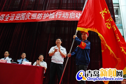 ????會上,市公安局副局長姜集喜向治安志愿大隊代表胡靖授旗,所有參會人員在印有“保全運迎國慶巡防護(hù)城行動”的橫幅上簽名,表達(dá)了為青島社會平安做出貢獻(xiàn)的決心。(記者 張以波)