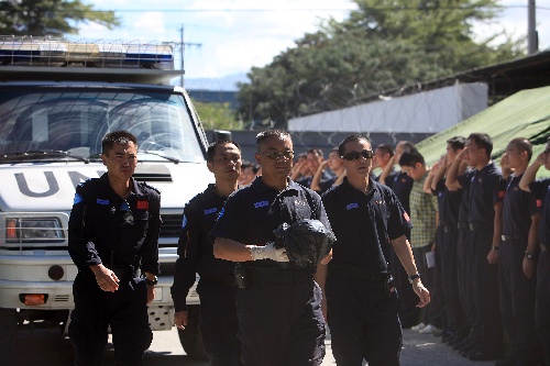 1月16日,在海地首都太子港,中國駐海地維和警察防暴隊的官兵運送被埋戰(zhàn)友遺體回營地。新華社記者邢廣利攝