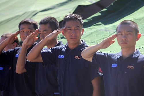 1月16日,在海地首都太子港,中國駐海地維和警察防暴隊的官兵向被埋戰(zhàn)友的遺體敬禮。 新華社記者邢廣利攝