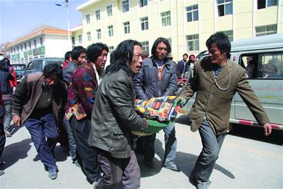 ????玉樹州委宣傳部副部長卓華夏描述了他看到的情況:玉樹賓館被震裂了一條大裂縫,州委辦公樓四樓會(huì)議室倒塌,倒下的建筑物將一輛停在樓下的車輛砸毀;大街上到處都是傷員,很多人頭上還流著血;在州職業(yè)學(xué)校,由于校舍倒塌,很多學(xué)生被埋在下面。