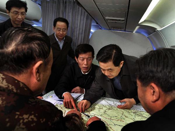 飛機(jī)在高速飛行。機(jī)艙內(nèi),中共中央總書記、國家主席、中央軍委主席胡錦濤專注的目光,聚焦在地圖上一個(gè)讓人揪心的地方——