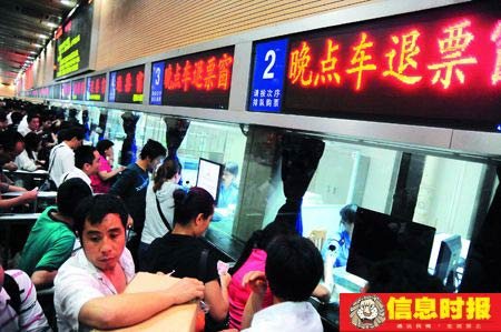 京廣線韶關(guān)段發(fā)生泥石流 45列車晚點(diǎn)3小時(shí)。圖為廣州火車站加開到10個(gè)退票窗口,供旅客退票。陸明杰 攝