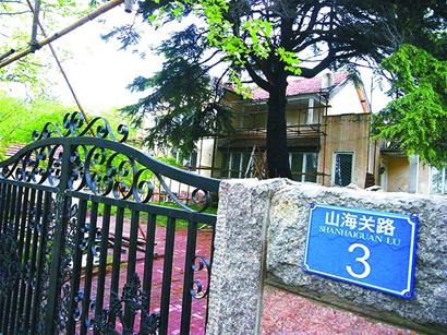 ????位于山海關(guān)路的幾幢別墅也都各具風(fēng)情,記者探訪了4棟別墅,都是鐵將軍把門無法進(jìn)入。山海關(guān)路5號是一幢日式的現(xiàn)代風(fēng)格建筑。鄧小平等政要曾在此下榻。山海關(guān)路11號別墅鐵將軍把門,摁門鈴也無人應(yīng)答。環(huán)衛(wèi)工說已有一段時間無人住了。山海關(guān)路3號別墅外圍豎滿了腳手架,黃色的外墻有些陳舊,但還算完好。山海關(guān)路1號曾是粟裕等將軍來青時的住所,別墅門口雕塑著兩個精美圖案,此處同樣是鐵將軍把門。