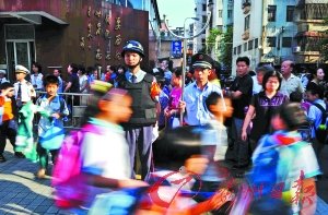 ????放學(xué)時分,東城小學(xué)門口,治安隊(duì)員正在守護(hù)學(xué)生安全。記者黃澄峰攝
