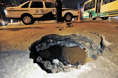 ????“之前馬路還是好好的,這輛出租車駛過,我們就聽見一聲悶響,接著就看到出租車前輪陷在路上,車尾部微微翹起,馬路上出現(xiàn)一個直徑約1米的深坑?!蹦繐粽邨钕壬Q,深坑突然出現(xiàn)在馬路中間的斑馬線上,出租車司機下車后也是一臉無奈,后來周圍很多人一起幫忙才把車從坑里抬出來。記者趕到現(xiàn)場時看到,南京路東側(cè)的江西路路段車輛已經(jīng)排起了長龍,交警正在現(xiàn)場調(diào)流,在塌陷的深坑前100米處橫著一輛警車,警燈閃爍向過往車輛示警。記者看到塌陷的坑口有古力蓋大小,深達兩米左右,下面沒有地基土,只留下20厘米厚的柏油路面。附近的搶修人員告訴記者,坑邊的路面下也可能沒有地基,要求大家站得遠一些。
