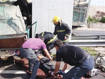 ????“濰萊高速上出車禍了,一個(gè)司機(jī)被卡在駕駛室里,消防官兵正在全力施救?!弊蛱煸缟?時(shí)許,市民苗先生撥打記者電話反映,他駕車經(jīng)過濰萊高速平度云山路段時(shí),親眼目睹了一起車禍,一輛拉水泥的貨車突然失控,撞上了路中央的隔離帶,司機(jī)猛打方向盤,導(dǎo)致車頭與車身分離,車頭又撞向了橋墩,破碎的駕駛室將半面橋墩裹了起來。貨車上的一名中年男子從駕駛室里甩了出來,滿頭是血,躺在路上一動(dòng)不動(dòng)。另一名男子被卡在駕駛室里不停地呻吟?!拔铱吹角闆r危急,趕緊撥打了119和120?!泵缦壬f,照當(dāng)時(shí)的情況看,司機(jī)可能是打盹了。 ????拖車上陣?yán)粍?dòng)車頭 ????平度市消防大隊(duì)立即趕赴現(xiàn)場(chǎng),被甩出的中年男子已經(jīng)被120抬到救護(hù)車上,送到醫(yī)院救治。頂入橋墩的貨車駕駛室已嚴(yán)重變形,從里面?zhèn)鞒鲆魂囮嚿胍髀暋?/p> ????“受傷男子的右胳膊被發(fā)動(dòng)機(jī)壓住,整個(gè)身子被卡住不能動(dòng)彈?!毕拦俦谔矫髑闆r后決定用拖車將駕駛室拖離橋墩。但由于卡得太緊,拖車連續(xù)拖了多次,駕駛室仍一動(dòng)不動(dòng)。原來,變形的駕駛室下部卡在了一截隔離帶上,消防隊(duì)員立刻改變計(jì)劃,先用液壓頂慢慢撐開駕駛室,然后兩名官兵爬進(jìn)駕駛室,用擴(kuò)張鉗將擠住受傷男子的發(fā)動(dòng)機(jī)撐開,上午9時(shí)許,困在駕駛室里的中年男子終于被救出,已守候多時(shí)的醫(yī)護(hù)人員隨后將他送往醫(yī)院搶救。記者昨天下午了解到,兩名傷者仍在醫(yī)院接受治療。 趙玉勛 蘭昌云 攝影報(bào)道 |