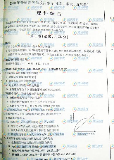 2010年高校招生全國(guó)統(tǒng)一考試?yán)砭C(山東卷)