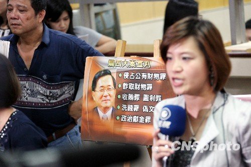 資料圖:2009年9月11日下午,涉及公務(wù)機(jī)要費(fèi)、龍?zhí)顿?gòu)地、貪污等案,陳水扁、吳淑珍夫婦被臺(tái)北地方法院一審判處無(wú)期徒刑,褫奪公權(quán)終身。許多臺(tái)灣媒體制作小看板,在臺(tái)北地院內(nèi)介紹陳水扁等涉案情況。 中新社發(fā) 黃少華 攝