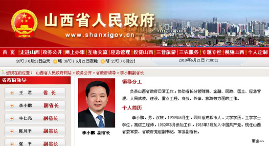 ????據(jù)山西省人民政府網(wǎng)站“省政府領(lǐng)導(dǎo)”欄目顯示,日前,李小鵬同志任山西省政府黨組副書記、常務(wù)副省長職務(wù)。