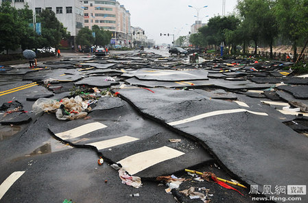 江西暴雨后路面成碎片