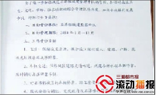 ????在石潭鎮(zhèn)政府,記者看到了一份3頁紙的《目標(biāo)責(zé)任狀》。這是今年1月,石潭鎮(zhèn)政府以該鎮(zhèn)城鎮(zhèn)建設(shè)委員會的名義,與石潭鎮(zhèn)城建監(jiān)察中隊(duì)簽訂的。最后一頁,蓋有石潭鎮(zhèn)政府和石潭鎮(zhèn)城建站的公章,并有張議的簽名。《目標(biāo)責(zé)任狀》規(guī)定,石潭鎮(zhèn)城區(qū)的車輛???、環(huán)衛(wèi)有償服務(wù)費(fèi),由石潭鎮(zhèn)城建監(jiān)察中隊(duì)征收,但必須按縣物價(jià)局核定的范圍和標(biāo)準(zhǔn)收取。2010年內(nèi),上交鎮(zhèn)城建站經(jīng)濟(jì)任務(wù)7.3萬元。城建監(jiān)察中隊(duì)人員的工資、福利、辦公經(jīng)費(fèi)等一切費(fèi)用,由監(jiān)察中隊(duì)自行負(fù)責(zé)?!赌繕?biāo)責(zé)任狀》還規(guī)定:目標(biāo)責(zé)任期內(nèi),石潭鎮(zhèn)城建監(jiān)察中隊(duì)必須按期如數(shù)完成經(jīng)濟(jì)目標(biāo)任務(wù)。否則,將扣除監(jiān)察中隊(duì)的工作保證金,并追究責(zé)任。