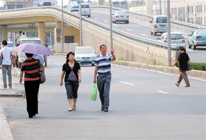 ????“大娘,您要過馬路的話,請(qǐng)走那邊的過街天橋好嗎?上面有電梯,走起來很方便的?!弊蛱焐衔?0時(shí),記者在威海路與臺(tái)東三路路口附近看到,在路口執(zhí)勤的交警正在勸阻一位拄著拐杖老人不要冒險(xiǎn)橫穿馬路。“我就到馬路對(duì)面的那家商店買點(diǎn)東西,很快就過去了,不用繞那么遠(yuǎn),我年紀(jì)大了,走天橋又不方便?!边@位大娘一開始望了望50米外的過街天橋,還是希望能夠穿過幾米寬的馬路到對(duì)面去。“要不我護(hù)送您走天橋吧!”聽到交警這樣提議,這位老大娘急忙擺了擺手,自己朝過街天橋走過去。