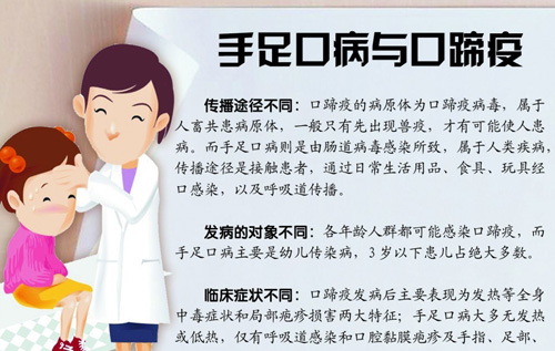 ????針對(duì)一些家長(zhǎng)將手足口病與口蹄疫相混淆的問(wèn)題,市疾控中心專(zhuān)門(mén)提醒,手足口病與口蹄疫是截然不同的兩種傳染病,傳染源、傳播途徑、發(fā)病人群、癥狀體征等都不相同,切不可混淆。