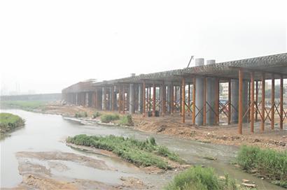 ????記者還注意到,項(xiàng)目部除了澆筑橋面,還有幾輛挖掘機(jī)忙著清理河道上的圍堰,施工人員告訴記者,去年年底項(xiàng)目開工后,首先進(jìn)行的是樁基工程,為了減少河道水對工程的影響,因此在河的北側(cè)建了一段高約兩三米的圍堰?!澳壳耙堰M(jìn)入汛期,尤其是7月底至8月中旬,雨量將達(dá)到全年最大,為了增強(qiáng)河道的泄洪能力,我們根據(jù)防汛辦的要求,把圍堰鏟掉,恢復(fù)河道。此外,由于大橋接線工程已基本進(jìn)入上部結(jié)構(gòu)施工,鏟掉圍堰對工程影響不大?!笔┕と藛T介紹。 (記者 孫靜芳 攝影報(bào)道)
