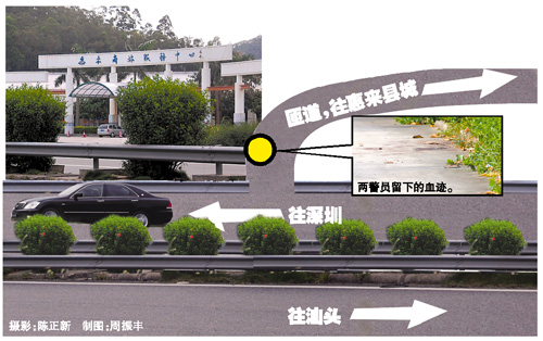 昨日記者來到事發(fā)現場,幾位揭陽市公安局交警支隊惠來高速公路大隊的民警正在現場做警戒。警戒線圍起的事發(fā)地點,就位于深汕高速進入服務區(qū)路口不遠處。這個路口可以通往惠來縣城,也可通往惠來高速公路大隊。
