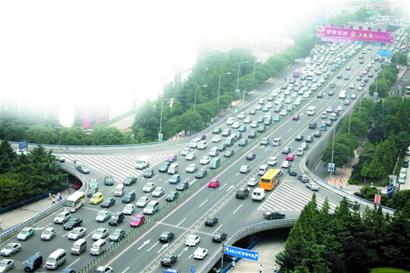 ????昨天上午7時,記者沿東西快速路由東向西行駛,一路行車順暢,當(dāng)行駛至澳柯瑪立交橋時,西向東車道車流密集,偶爾有擁堵現(xiàn)象,立交橋底層山東路的北向南車道車輛更是密密麻麻。7時30分左右,記者來到澳柯瑪立交橋東北側(cè)的博思小區(qū),到該小區(qū)18樓頂層平臺俯視澳柯瑪立交橋周邊交通狀況??v覽澳柯瑪立交橋交通全局后,給記者第一個感覺便是“冰火兩重天”。在山東路上延吉路至江西路段,至少有1000輛車密密麻麻地排列著,車尾部剎車燈全是紅色,遠遠望去形成一條紅色“長龍”。而山東路南向北車道車輛卻稀稀拉拉,每隔十幾米才能見到一輛車。