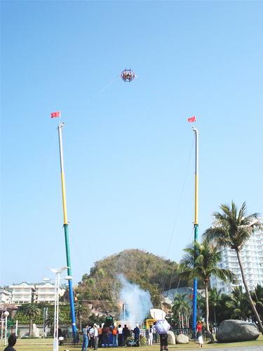 ????本屆啤酒節(jié)另有一臺(tái)首次亮相的游樂設(shè)施——火箭蹦極,又叫彈射椅,采用滑輪彈簧組結(jié)構(gòu),塔桿高度24米,最大彈射高度為36米.游客在彈射椅上固定好后,彈射椅下部的彈射機(jī)構(gòu)將瞬間把人從地面彈向36米高空,經(jīng)往復(fù)反彈后復(fù)原,讓游客體驗(yàn)到“異樣”蹦極的極度刺激感。