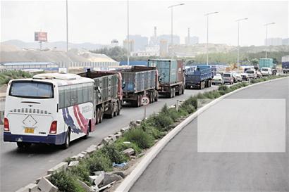 ????昨天中午12時15分,記者沿環(huán)灣大道返回市區(qū),行至距離新雙埠收費站1公里、雙埠立交橋下路段時,此處道路彎彎曲曲,大貨車及大巴車經(jīng)行此處時均小心翼翼,車速非常緩慢,不一會便聚集了大量車流。
