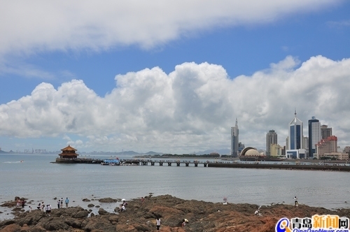 ??? 今天,青島陽光格外明媚,天上云卷云舒,有的像棉絮朵朵,有的似連綿山巒,海天一線間,宛如一幅幅美麗的畫卷。尤其在棧橋,行人如織,從遠處望去,猶如畫中游一般。