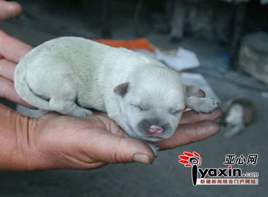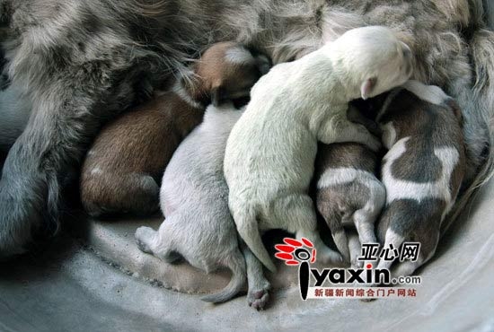 7月24日,頭屯河區(qū)一家從事汽車廢品收購的居民家的狗生孩子了,沒想到的是,6只小狗中除了有白色、黑白花的之外,還有一只狗的毛是淡綠色的。亞心網(wǎng)記者 秦梅花 實習生 周惠雯蕊 攝