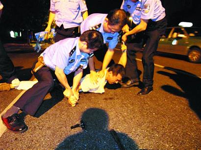 今晨2時(shí)05分 男子持菜刀砍向保安 今晨2時(shí)許,正在天虹花園小區(qū)南門口值班的保安老詹看到一名男子在大門口來回轉(zhuǎn)悠,行跡有些可疑,于是上前盤問。 “你干什么呢?”“我想干什么就干什么,再多嘴老子砍死你! ”老詹說,他沒有想到自己的一句話惹來對(duì)方如此暴怒,還未等他反應(yīng)過來,對(duì)方就從隨身攜帶的一個(gè)包內(nèi)掏出一把明晃晃的菜刀朝他頭上砍了下來。 “我當(dāng)時(shí)沒看清他用什么砍的我,就下意識(shí)地用右手一擋,就感覺鉆心地疼,一看才發(fā)現(xiàn)是菜刀?!崩险舱f,自己的右手汩汩冒出鮮血,可對(duì)方仍然不放過,揮起菜刀再次朝他砍來。今年46歲的老詹,在市南區(qū)天虹花園小區(qū)當(dāng)了許多年保安,這是敬業(yè)的他第一次遭遇生死一幕。 老詹見勢不妙,一邊逃跑一邊找地方躲避,在追趕了兩百多米后,這名手持菜刀的中年男子停了下來,先是罵罵咧咧了一陣,隨后提著菜刀離去。瞅準(zhǔn)機(jī)會(huì),老詹趕緊撥打110報(bào)警,并用對(duì)講機(jī)通知其余兩名同伴增援。由于擔(dān)心這名手持菜刀的男子跑掉或者再砍傷其他人,老詹一邊在后面悄悄尾隨,一邊隨時(shí)告知民警歹徒所處位置。 “他當(dāng)時(shí)提著菜刀,沿著寧夏路朝 青島大學(xué)走去,一路上拿著菜刀亂揮舞。 ”老詹說,他當(dāng)時(shí)最擔(dān)心的是歹徒持刀闖進(jìn)大學(xué)校園, “校園里學(xué)生太多了,要是真闖進(jìn)哪個(gè)宿舍后果不堪設(shè)想。 ”短短幾分鐘,一輛110警車火速趕到,在青島大學(xué)西門附近將手持菜刀的男子截停下來。此時(shí),本報(bào)記者也第一時(shí)間趕至現(xiàn)場。 今晨2時(shí)25分 見記者拍照揮刀威脅 兩名民警從飛速趕到的110警車上下來后,沖著手持菜刀的男子喊話。 “有什么事情可以商量,趕快把刀先放下來! ”“我就是不放,有本事你們就上來! ”民警沖著他苦口婆心地勸說,可對(duì)方絲毫不為所動(dòng),仍然拿著菜刀到處揮舞。由于對(duì)方情緒過于激動(dòng),擔(dān)心強(qiáng)攻不成會(huì)傷及到路邊行人,兩名民警沒敢貿(mào)然沖上去。民警一邊設(shè)法與其周旋,一邊求援增派警力。隨后,金門路派出所的一輛警車在幾分鐘內(nèi)也火速增援到現(xiàn)場。 4名民警站在七八米遠(yuǎn)的地方與該男子展開了對(duì)話。記者在現(xiàn)場看到,手持菜刀的男子年紀(jì)在40歲左右,身高約1.75米,留著平頭,上身穿著一件白色襯衣,下身穿一條白色運(yùn)動(dòng)褲,腳蹬一雙灰色旅游鞋。雖然民警平心靜氣地勸說了十幾分鐘,但這個(gè)“菜刀男”卻絲毫沒有放棄抵抗的意思,仍然舉著菜刀到處亂跑,不時(shí)沖著民警比劃著,看到記者拍照時(shí),還比劃著要朝記者扔菜刀,為避免意外,記者趕緊后撤幾步。 |