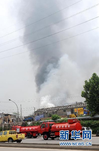 7月28日,消防車??吭谑鹿尸F(xiàn)場附近。新華社記者孫參攝
